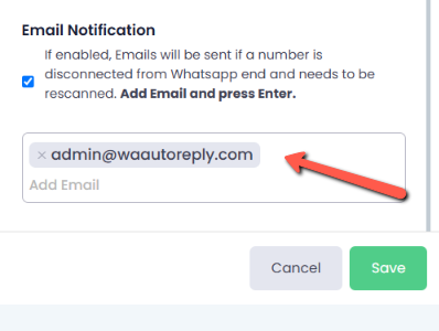 • If enabled, emails will be sent when a number is disconnected from WhatsApp and needs to be rescanned. Enter your email address and press Enter to save.